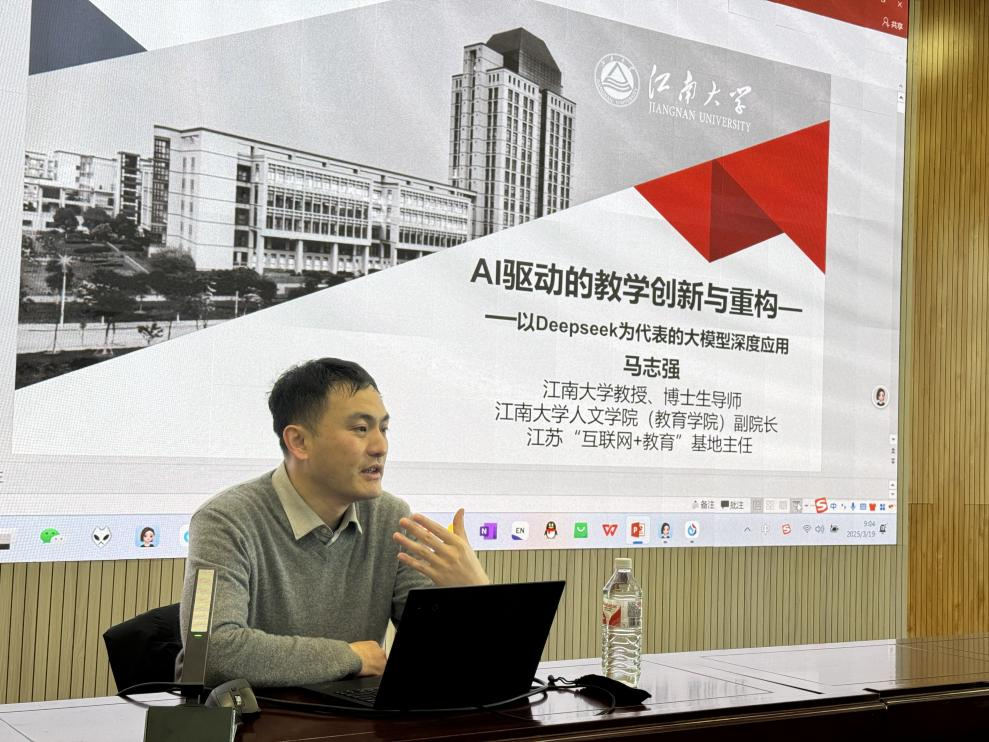 3月19日上午,人力资源处(教师教学发展中心)邀请江南大学教育学院副院长、博士生导师马志强教授,在综合楼裙楼D202开展以“AI 驱动的教学创新与重构——以DeepSeek为代表的大模型深度应用”为主题的专题讲座,来自各二级学院150余名教师参训。讲座由人力资源处副处长彭伊凡主持。